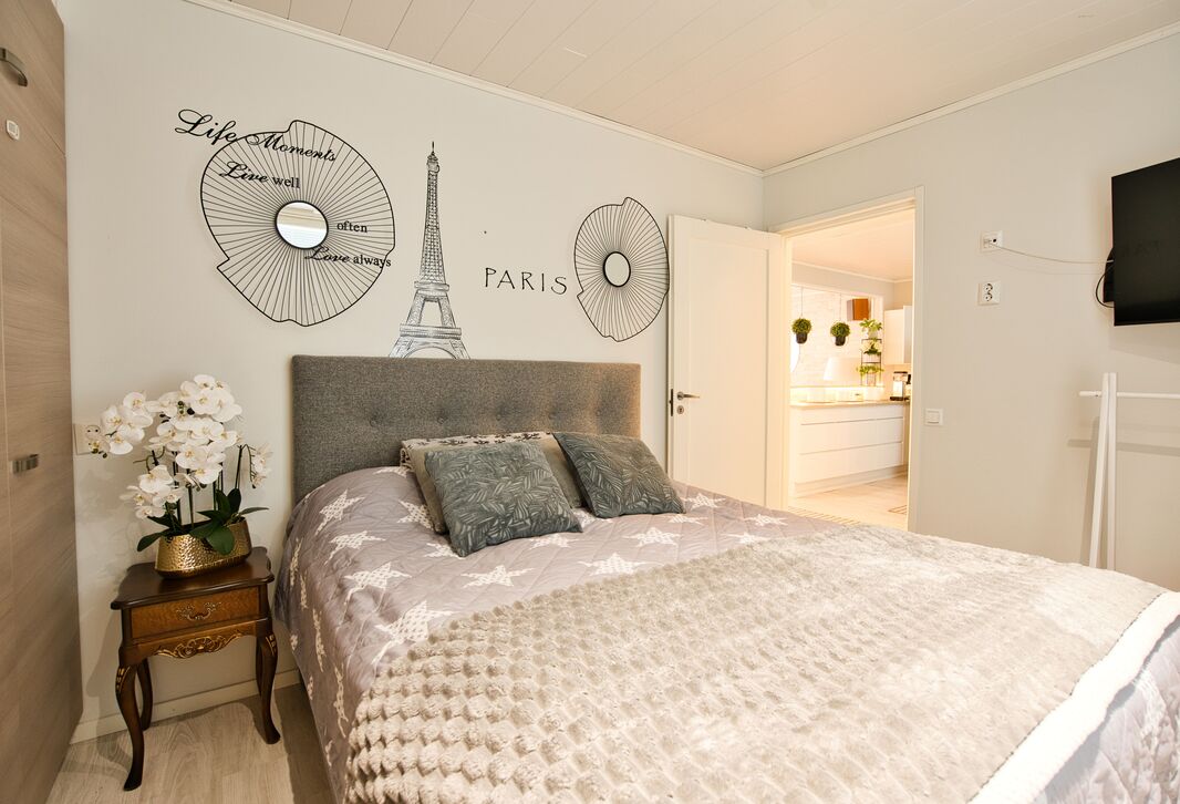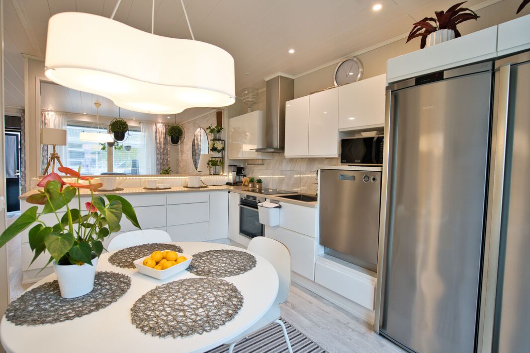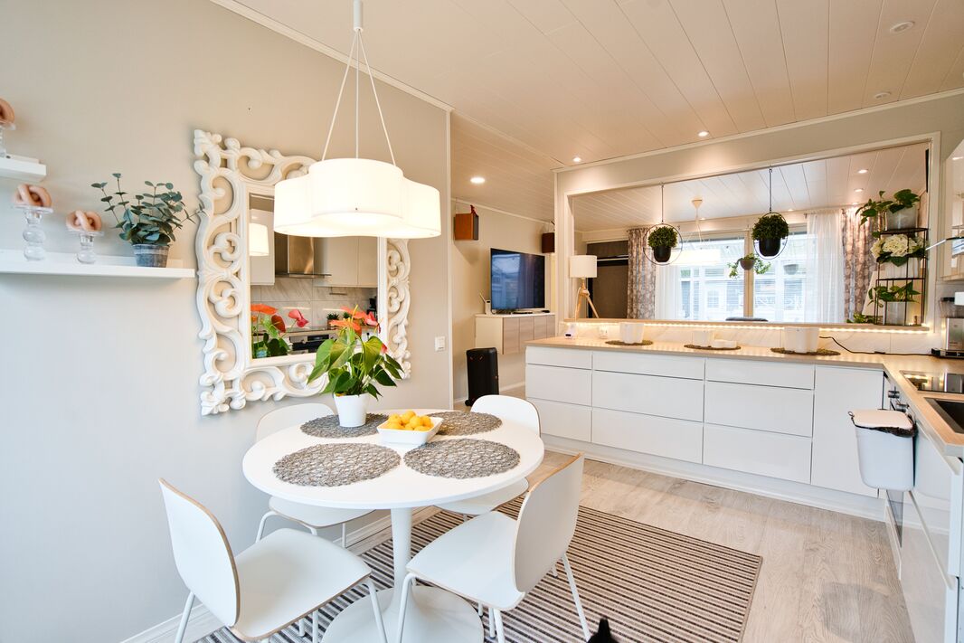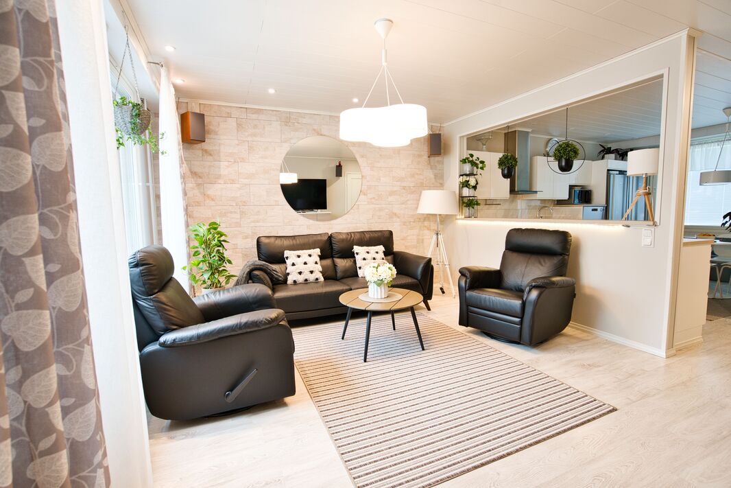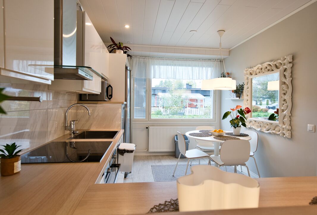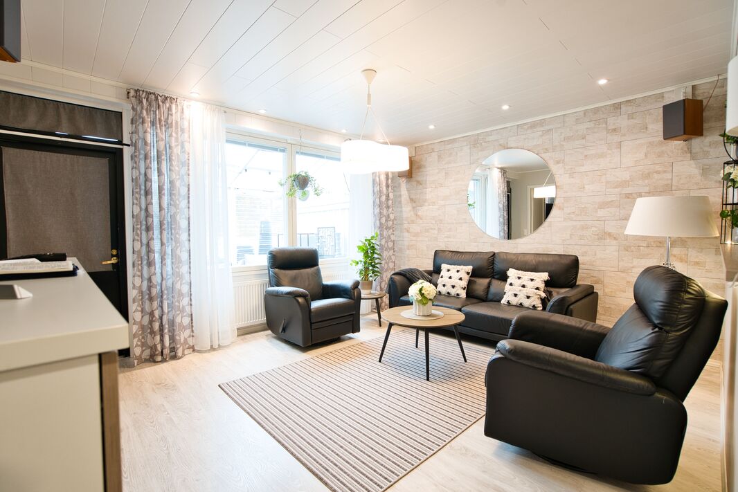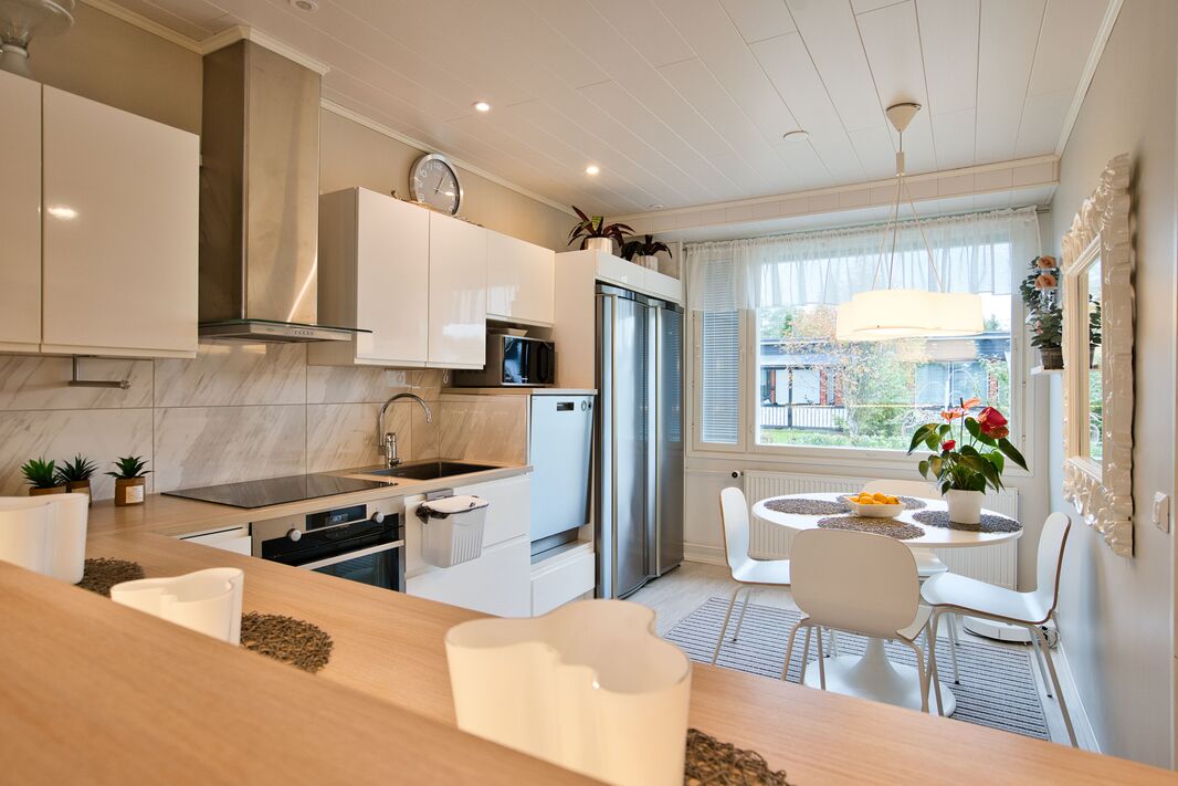 Olohuoneessa on runsaasti luonnonvaloa ja tilaa mukavasti oleskelulle. Tyylikäs, täysin uusittu keittiö hurmaa käytännöllisyydellään ja laadukkailla kodinkoneillaan – arki sujuu täällä vaivattomasti. Makuuhuoneet ovat tilavia ja tarjoavat erinomaiset säilytysratkaisut sekä rauhalliset puitteet lepoon.