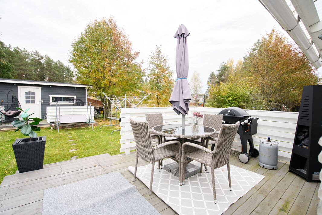 Kylpyhuone on toteutettu ajattoman modernilla tyylillä, ja oma sauna tuo ripauksen arjen luksusta. Asunnosta on käynti omalle, aidatulle piha-alueelle, joka kutsuu viettämään aikaa ulkona ja nauttimaan kesäilloista terassilla.